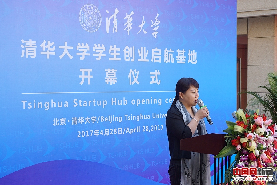 2017年4月28日上午,中关村智造大街CEO程静在清华大学学生创业启航基地开幕仪式上发言。