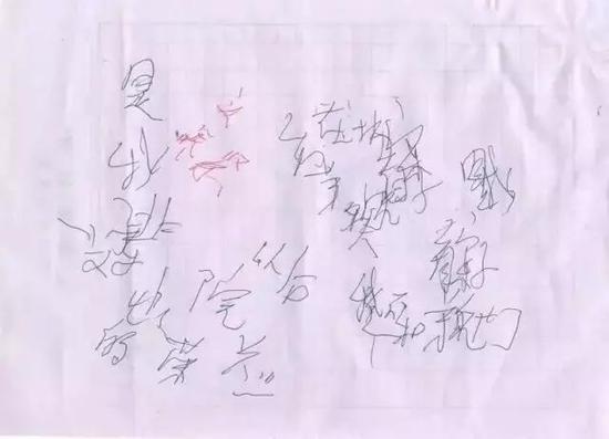 徐丽芹拿着手里的另一张纸条与站在旁边的陈錾(曹县检察院公诉科科长)一块辨认,“给他们说一下,让他们替我开庭。”陈錾说,“这是写给我的,说让我安排好王勇办理案件的出庭事宜。”徐丽芹辨认着纸条上的内容,说:“这是写给我的,写的是‘给俺娘说,别担心’。”