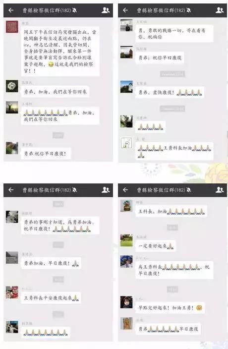 得知王勇得病的消息后,同事们以各种方式表达着对王勇的关切,微信群里更是满满的祝愿……