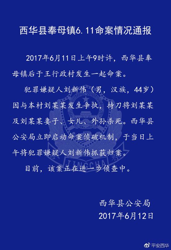 犯罪嫌疑人刘新伟(男,汉族,44岁)因与本村刘某某发生争执,持刀将刘某某及刘某某妻子、女儿、外孙杀死。西华县公安局立即启动命案侦破机制,于当日上午将犯罪嫌疑人刘新伟抓获归案。