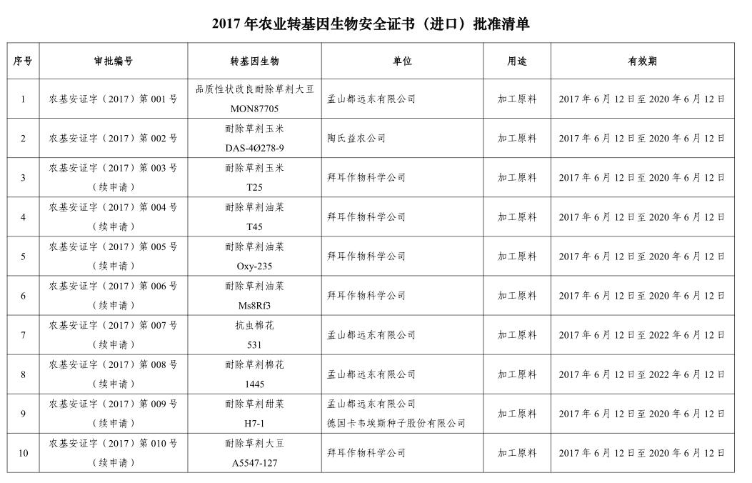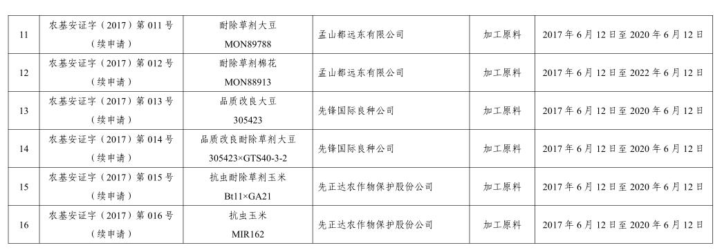 获得该证书的公司包括孟山都、拜耳、陶氏益农、先锋国际、先正达,证书有效期大多数为3年,即2017年6月12日至2020年6月12日。