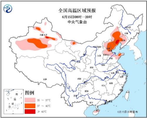 中国网6月15日讯 据中央气象台网站消息,15日6时继续发布高温黄色预警:预计,15日白天,内蒙古东部偏南地区、辽宁中西部、北京、天津、河北大部、山东北部及新疆南疆盆地等地有35℃以上的高温天气。