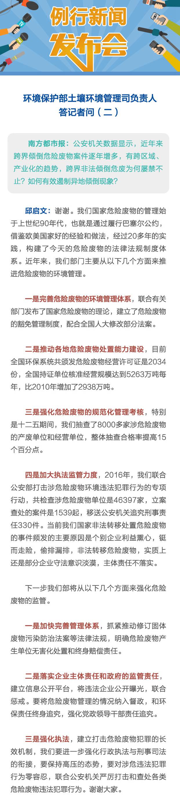 邱启文回应:“当前我们国家非法转移处置危险废物的事件频发的主要原因是个别企业利益熏心,铤而走险,偷排漏排,非法转移危险废物,实质上还是部分企业守法意识淡漠,主体责任不落实。”