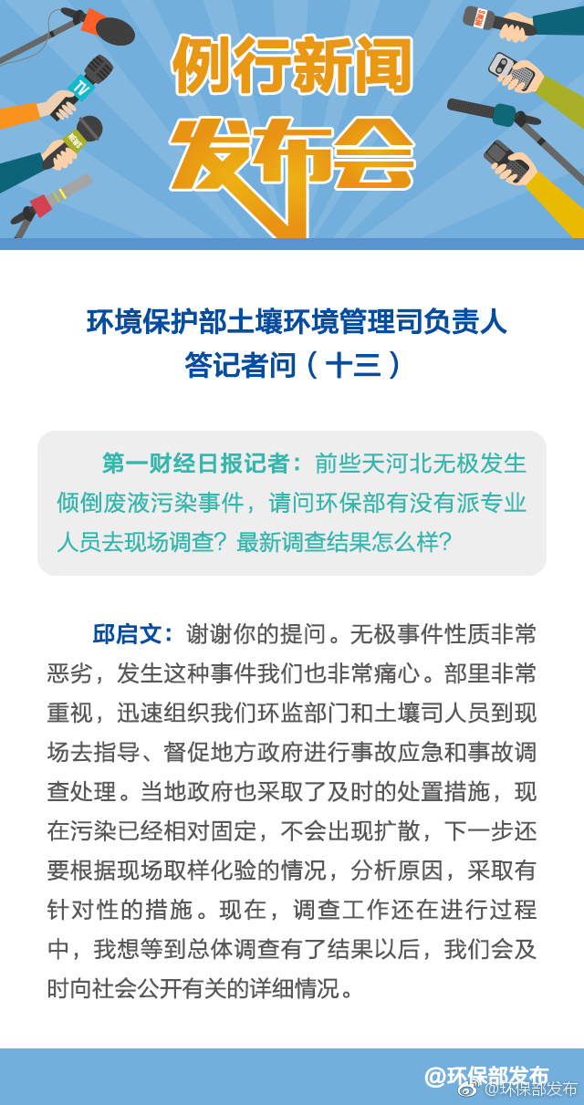 针对河北无极发生倾倒废液污染事件,邱启文表示,河北无极倾倒废液污染事件非常恶劣,环境保护部非常重视,迅速组织环监部门和土壤司人员到现场去指导、督促地方政府进行事故应急和事故调查处理。当地政府也采取了及时的处置措施,现在的污染已经相对固定,不会出现扩散,下一步还要根据现场取样化验的情况,分析原因,采取有针对性的措施。