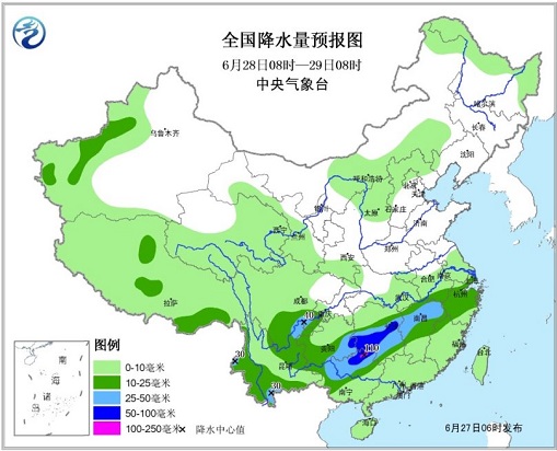 中国网6月27日讯 据中央气象台消息,27日至28日,江南、华南西部以及云南、贵州等地有大到暴雨,29日起雨带北抬。其中,27日8时至28日8时,广西中北部、广东北部、贵州南部、湖南中南部、江西中南部、福建北部、浙江南部、云南东部等地有大到暴雨,其中,广西东北部、湖南南部、江西东部等地局地有大暴雨(100~120毫米);上述部分地区有短时强降水、局地伴有雷暴大风等强对流天气,最大小时雨强30~50毫米,局地可超过60毫米。中央气象台6月27日6时继续发布暴雨黄色预警。