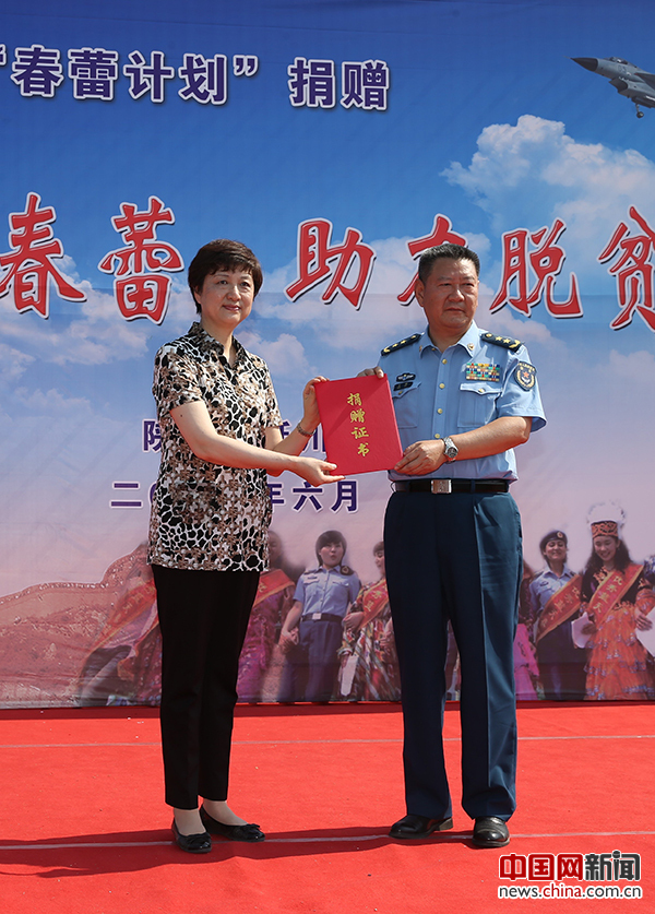 全国妇联副主席、书记处书记邓丽向空军纪委书记宋琨颁发捐赠证书。中国网记者 陈维松 摄