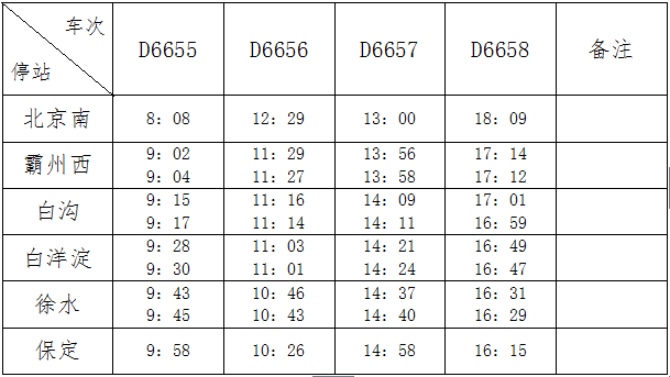 据悉,此次开行的2对动车组分别为:D6655/6次和D6657/8次,早午各一对,沿途停靠霸州西站、白沟站、白洋淀站、徐水站,始发终到为北京南站和保定站,列车全程运行约1小时50分钟。