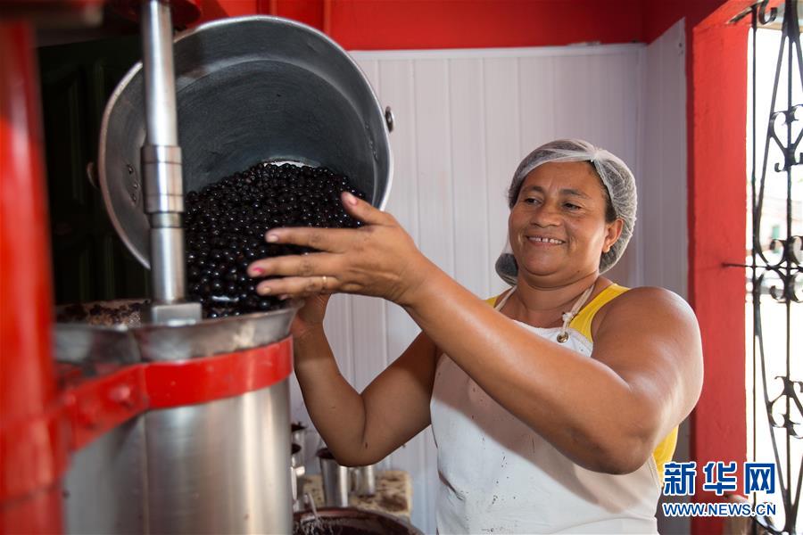 7月15日,在巴西北部帕拉州维基亚市的“阿萨伊之家”小店,工作人员格洛丽亚将阿萨伊果倒入机器内打磨成果浆。阿萨伊果是产于亚马孙雨林地区一种棕榈树的果实,也被称作巴西莓。其果核直径7至10毫米,可使用的果肉厚度只有1毫米,其中富含维生素C、磷、钙、铁等,抗氧化效果尤其显著,因此被称为巴西的“超级水果”。巴西北部的亚马孙州和帕拉州两个州是阿萨伊果的主要产区。新华社记者李明 摄