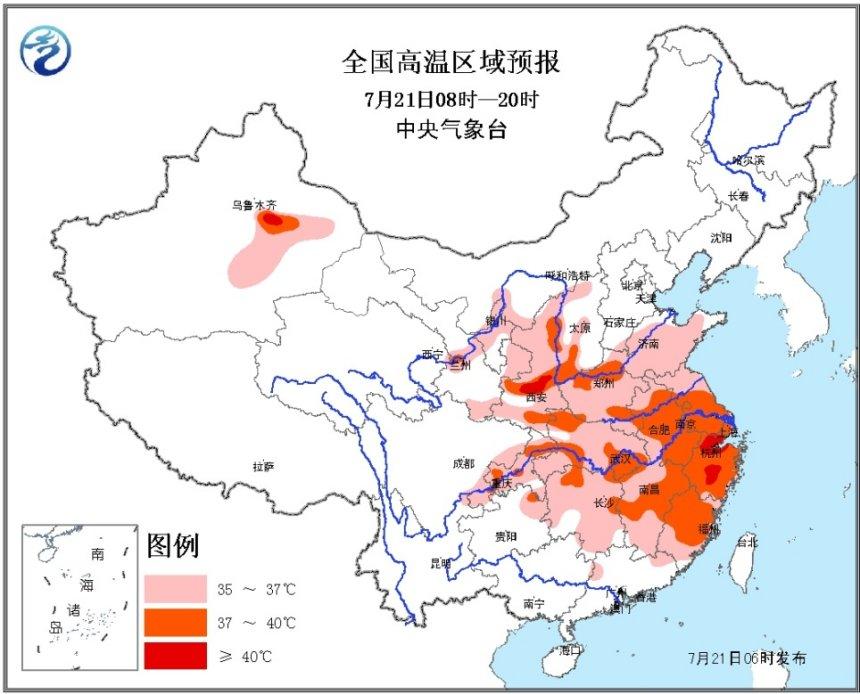 中国网7月21日讯 据中央气象台网站消息,中央气象台7月21日06时继续发布高温橙色预警:预计,7月21日白天,西北地区东部、华北南部、黄淮大部、四川盆地东部和南部、江淮、江汉、江南、华南东部等地有35℃以上的高温天气,其中,陕西关中地区、山西西南部、河南中部和东南部、苏皖中南部、上海、浙江、江西中东部、福建中北部、湖北东南部和西部、湖南北部和东部、重庆北部和西部等地的部分地区最高气温可达37~39℃,局地可超过40℃。