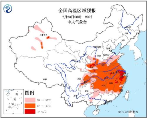 预计,7月23日白天,西北地区东部、黄淮、四川盆地东部、江汉、江淮、江南、华南北部等地有35℃以上的高温天气,其中,陕西关中地区、河南、山东南部、安徽、江苏、上海、浙江、福建、江西、湖北、湖南、四川盆地东部、重庆等地的部分地区最高气温可达37~39℃,局地可超过40℃。