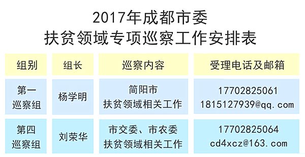 此次专项巡察工作由成都市委第一、第四巡察组负责实施。其中,第一巡察组深入简阳乡镇、村(社区)生产一线和扶贫项目实地走访核查,特别是对反映党员领导干部在扶贫工作中的重要问题和线索进行重点深入了解;第四巡察组则深入市交委定点扶贫村邛崃市水口镇陈沟村和市农委定点扶贫村金堂县转龙镇红豆村进行走访、核查。同时,巡察组还将对援藏脱贫等项目进行巡察。