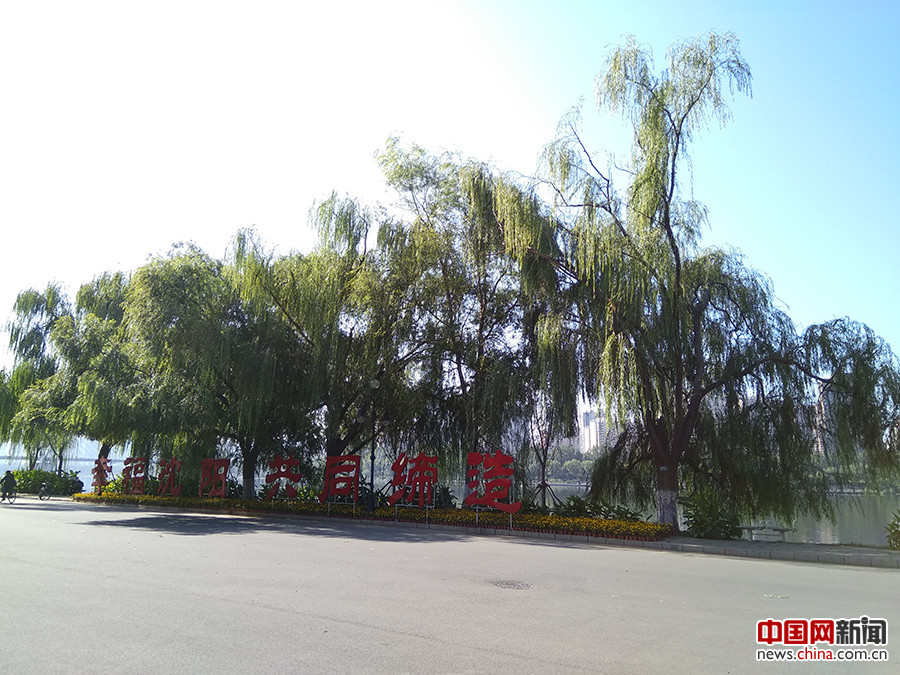 2017年9月20日,50余家全国重点网络媒体的记者走进辽宁省沈阳市浑河南岸的沈水湾公园。图为公园外设立的标语。中国网记者 吴佳潼 摄