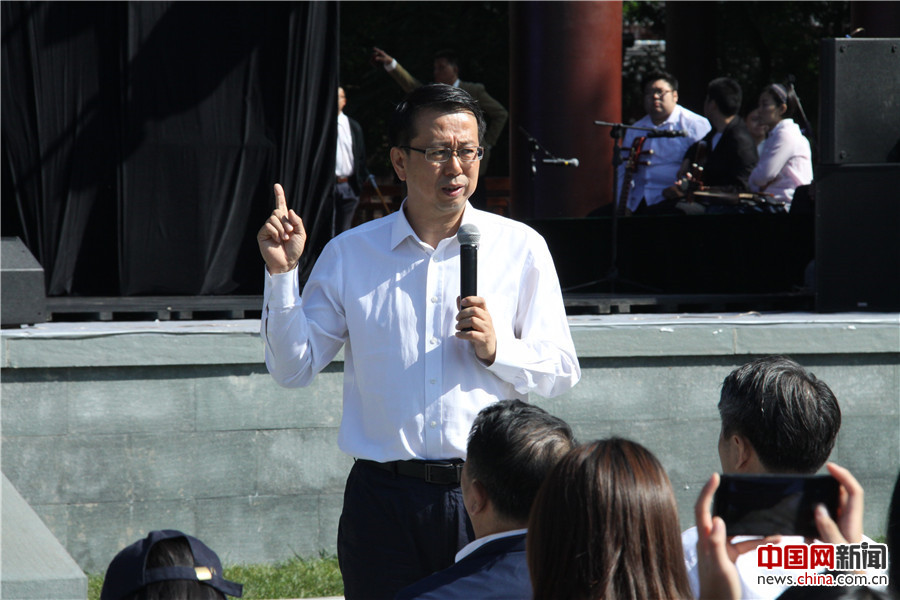2017年9月20日,50余家全国重点网络媒体的记者走进辽宁省沈阳市浑河南岸的沈水湾公园。图为沈阳市和平区委常委、宣传部部长安建晔介绍一河两岸和平段情况。中国网记者 吴佳潼 摄