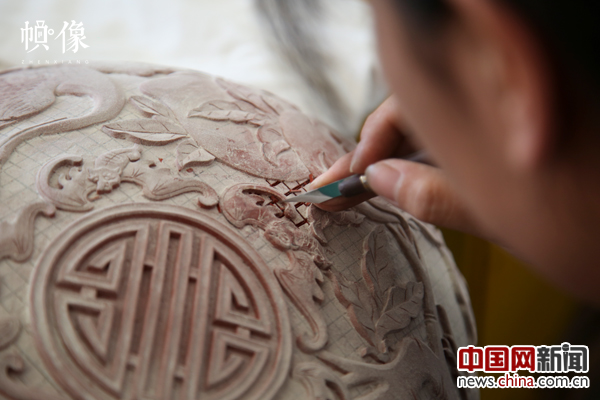 2017年9月20日,“明古斋”雕漆工厂车间,北京工艺美术雕漆大师杨之新指导徒弟雕刻作品。中国网记者 黄富友 摄【点击观看组图】