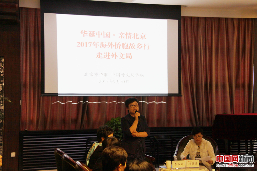 9月30日,中国外文局,北京市侨联代表及海外侨胞与外文局侨联及各单位代表进行交流座谈。图为北京市侨联副主席李冬娟发言。林琨 摄