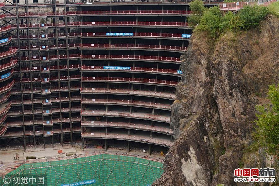 据了解,“深坑酒店”选址在旧矿场形成的深坑,建成后酒店将拥有近400间客房,包括地上2层和地下16层,最底下的2层建筑为水下建筑。蓝镜/视觉中国