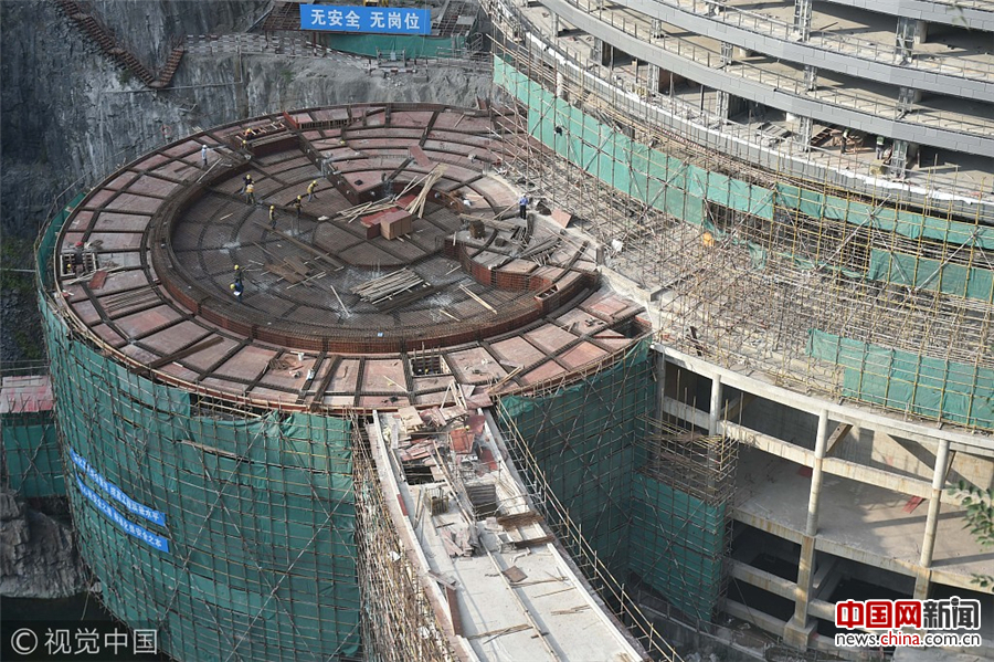 历经8年多建设,深坑酒店近日进入最后的装饰装修环节。这座投资6亿元建造的酒店,位于一座深达80米的废弃大坑内,这里曾经是一座旧矿场。蓝镜/视觉中国