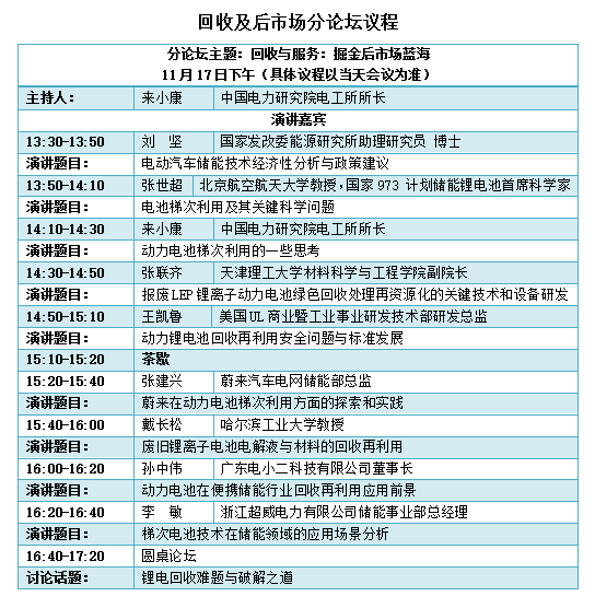 以“回收与服务:掘金后市场蓝海”为主题的回收及后市场分论坛将于17日下午举办,分论坛由中国电力研究院电工所所长来小康主持。会议亮点太多,以下为具体议程,大家先睹为快: