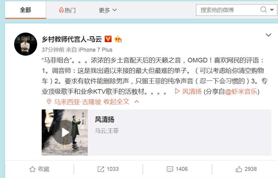 11月3日下午,电影《功守道》发布由马云和王菲共同演绎的主题曲《风清扬》。这首歌曲不仅是“灵魂歌手”马云的首支单曲,也是王菲时隔一年多首次推出新歌,在虾米音乐首发上线之后,迅速引起网友的关注和热议。马云随后也在微博上就歌曲与网友互动。