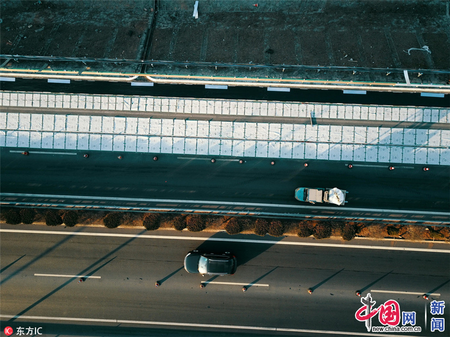 2017年12月13日,济南绕城高速公路南段,施工人员正在铺设光伏路面,地面上一个个白色方格下方就是太阳能电池。