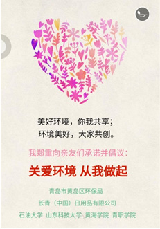 长青中国携手青岛西海岸新区环保局和驻区的四所高校联名开展了“关爱环境、从我做起、不乱丢垃圾、不车窗抛物”的微信传递活动。该项公益活动成功动员了数万名大学生的参与,通过朋友圈的微信传递,直接影响到了数百万人。