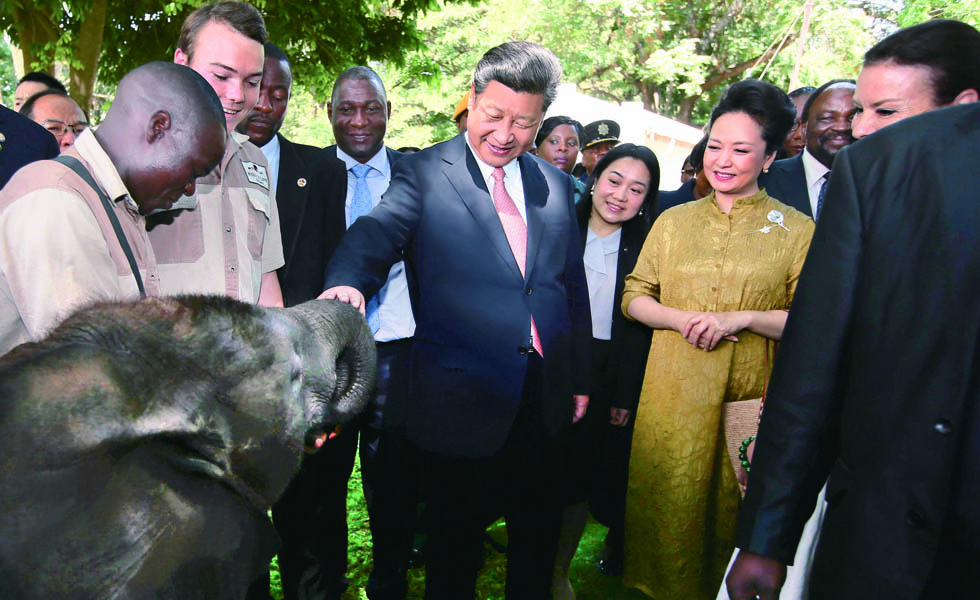 2015年12月2日,习近平在津巴布韦考察野生动物救助基地。这是习近平和夫人彭丽媛察看基地救助的大象、长颈鹿等野生动物。