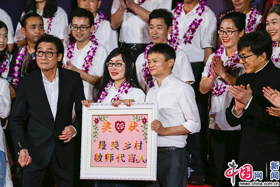 获奖乡村教师王秀丽给阿里巴巴董事局主席马云带来一张手工创意奖状:“最美乡村教师代言人”。中国网记者 陈维松 摄