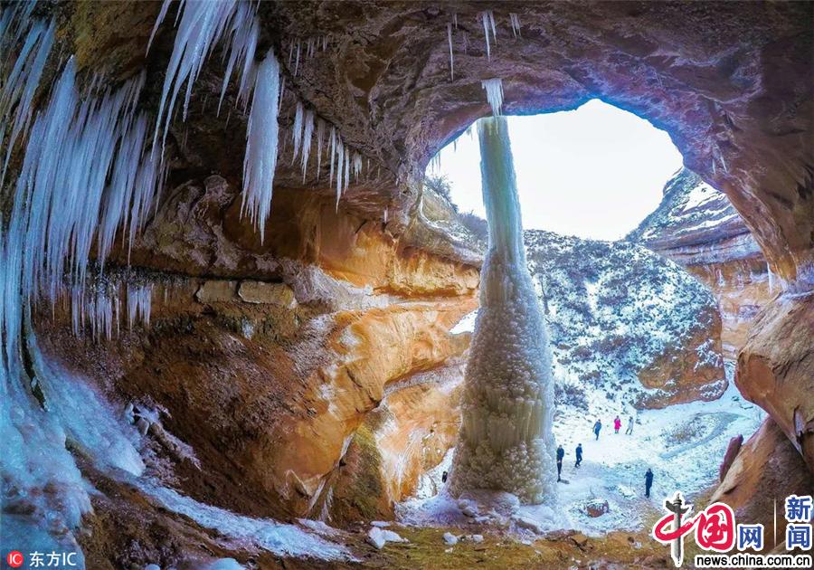 2018年1月30日,陕西咸阳旬邑县赵家洞老山沟一处丹霞地貌出现巨型冰柱。洁白如玉的冰柱顺着崖壁“飞泻”而下,溅起一朵朵壮观的“冰花”,吸引了不少市民前来拍照。佚名/东方IC
