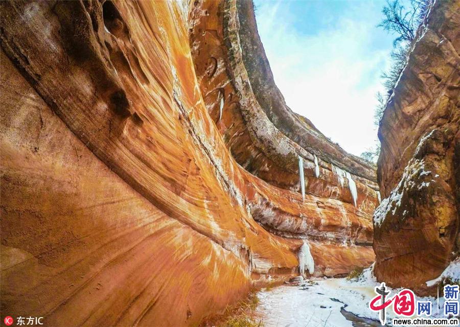 咸阳一丹霞地貌山谷现巨型冰柱