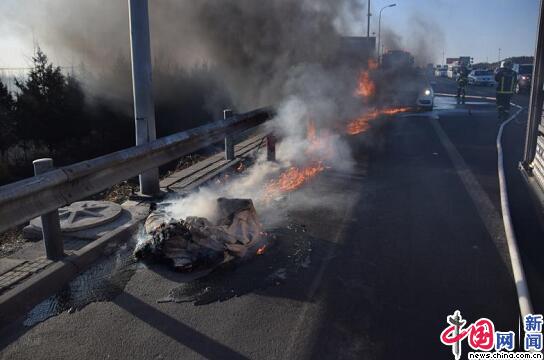 通过向车主了解情况得知,事故车辆行驶途中,前方一辆货车掉落被褥卷入该轿车底部,经过一段时间行驶被褥起火,随后引燃轿车。
