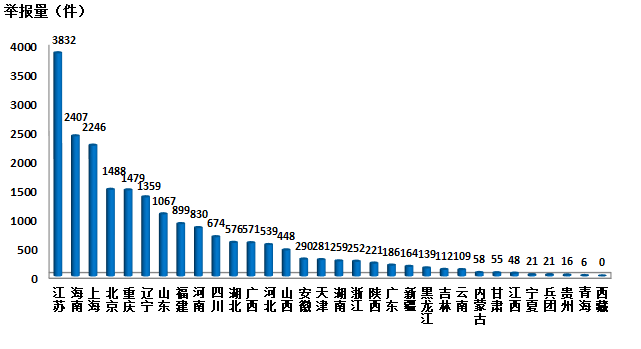 网上举报相比上月减少1210件,环比降低18.4%;相比去年同期增加2518件,同比增长88.7%。其中广东、河南、山东三省公众使用网上举报相对频繁,举报数量合计约占全国总数的33.5%。