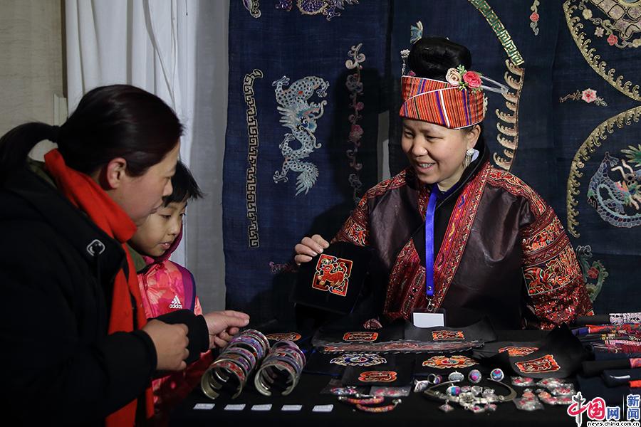 2018年2月17日,北京中华世纪坛,来自黔东南台江施洞的苗族国家级非遗传人刘正花向观众展示苗绣。中国网记者 陈维松 摄