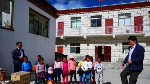 2015年秋天,周会明和安徽其他两位援藏干部到浪卡子县一乡村小学捐助电教、学习、体育用品及衣物,并和藏族孩子们一起玩足球。