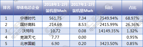 2018年1-2月磷酸铁锂电池的装机量为814.55Mwh,市场占有率为35.57%,与2017年同期相比,增长了1100.74%,结束了2017年年初噩梦般的同比率。