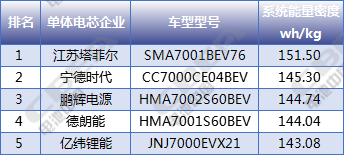 2018年1-2月新能源汽车配套三元动力电池系统能量密度排名