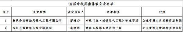 中国网4月19日讯 近日,住建部对申报建设工程企业资质弄虚作假行为进行通报,涉重庆泰格石油天然气工程有限公司、四川合富建筑工程有限公司两家企业。