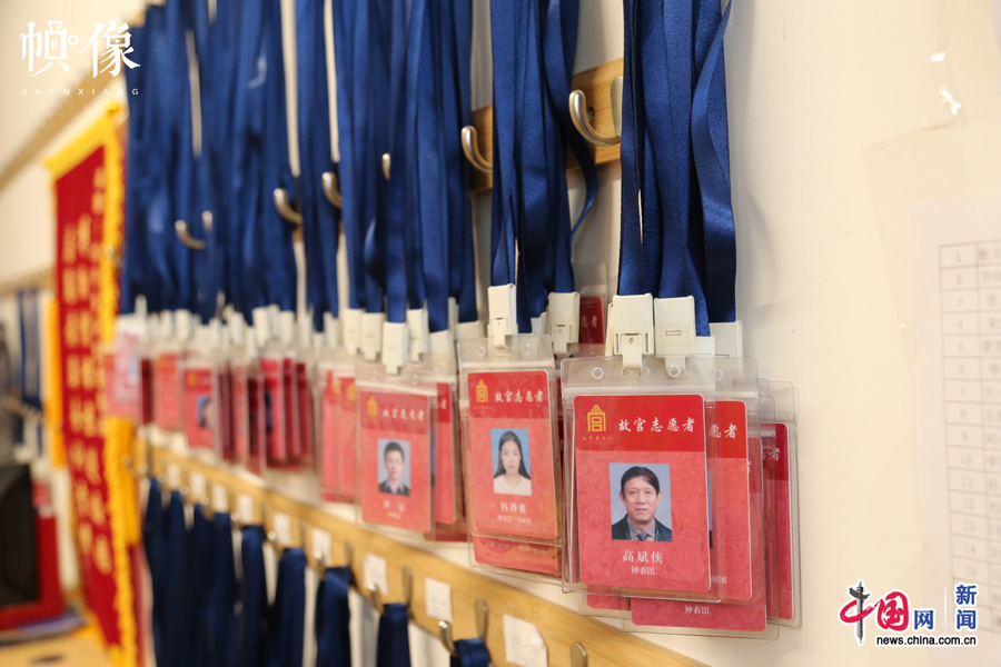 志愿者工作站内,墙上整齐地挂着一排排故宫志愿者工作证。中国网实习记者 赵丹 摄