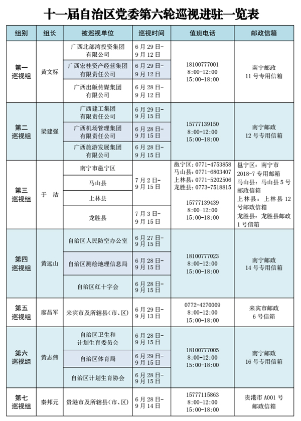 十一届自治区党委第六轮巡视进驻一览表。图片来源 广西壮族自治区纪委监委