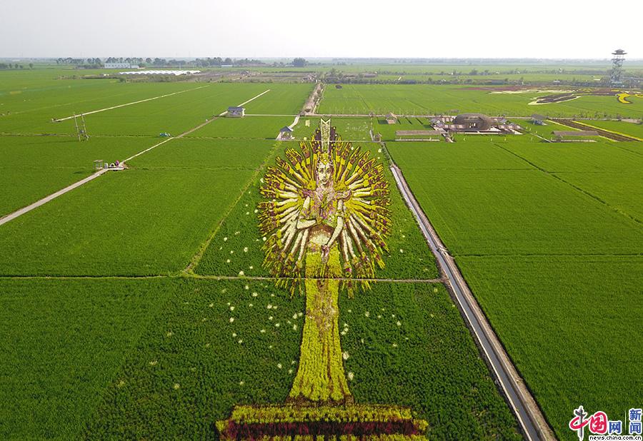 2018年7月4日,沈阳,3D稻田画《千手观音》种植难度系数上挑战世界之最,占地约10亩,通过北斗和GPS定位点就达27000个点位,技术人员和当地农民20余人,用近一个月的时间边定点,边插秧,边修整。田卫涛 摄
