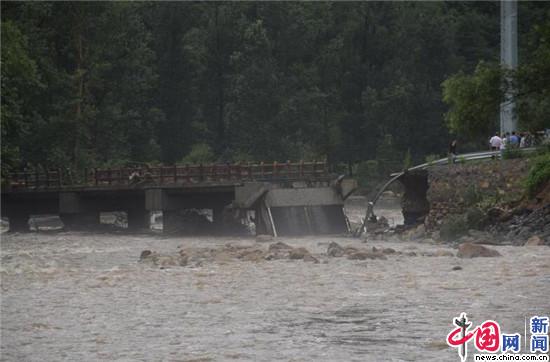 中国网7月16日讯 昨日,北京怀柔区普降大暴雨,辖区多处位置发生道路、桥路被洪水冲毁事件,琉璃庙镇龙泉峪村位于怀柔区北部山区,与外界连接仅仅只靠一座桥,暴雨引发山洪,将桥梁冲成两段,村里与外界唯一的交通纽带中断了。