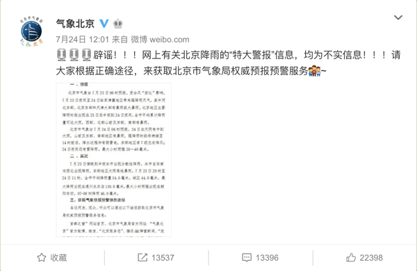 7月23日起,有微信朋友圈转发“特大警报:明天中午到夜间,有特大暴雨、极大的狂风和强烈雷电覆盖京津冀,已经大到雷达回波无法测量的上限,是六年来最大的冷涡暴雨”。当日,北京市气象局出面辟谣。