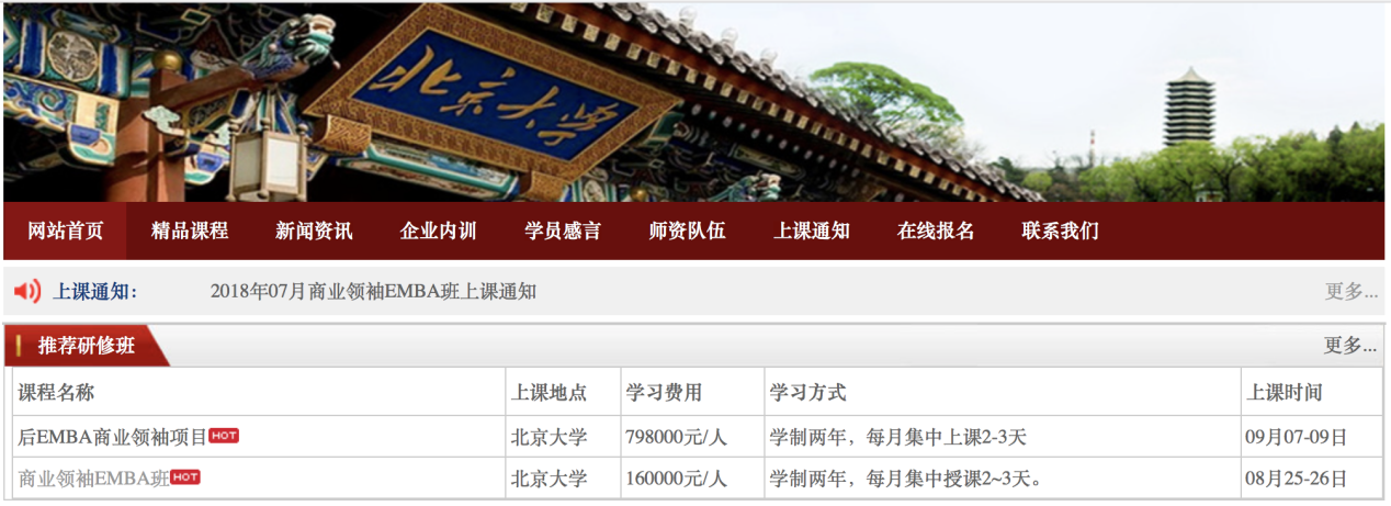 显示北大“商业领袖EMBA班”正在招生的野鸡培训机构网站。图为网页截图