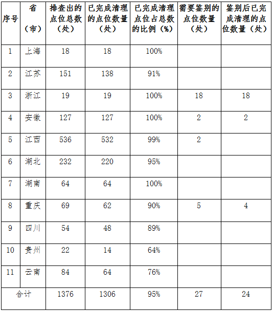 通报显示,长江经济带11省(直辖市)迅速清理整治排查出的1376处固体废物。其中,上海、浙江、安徽、湖南4省(市)已全部清理完成。