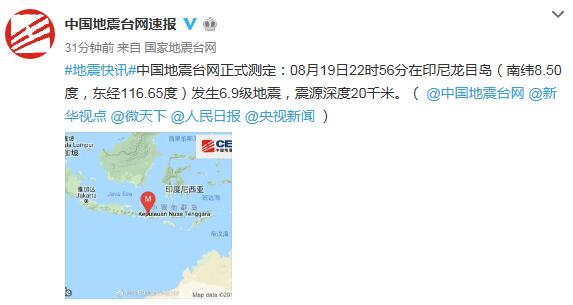 中国网8月19日讯 据中国地震台网消息,8月19日22时56分在印尼龙目岛(南纬8.50度,东经116.65度)发生6.9级地震,震源深度20千米。