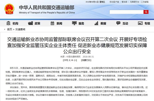 中国网8月31日讯 据交通运输部网站消息,8月31日,交通运输新业态协同监管部际联席会议召开第二次会议,决定自9月5日起,在全国范围内对所有网约车顺风车平台公司开展进驻式全面检查。部际联席会议召集人、交通运输部党组书记杨传堂、部长李小鹏出席会议并强调,要深入贯彻落实中央领导同志关于新业态发展的一系列重要指示批示精神,进一步统一思想、凝聚共识、提高站位,本着对党和国家高度负责、对人民群众生命财产安全高度负责、对维护社会和谐稳定高度负责的态度,认真开展好网约车顺风车平台公司联合专项检查,切实加强安全监管,压实企业安全主体责任,强化整改落实,更好促进新业态健康规范发展,保障公众出行安全。