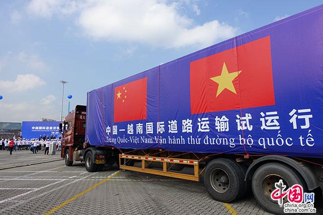 中国网9月19日讯(记者 张艳玲)由中越两国各4辆货车组成的车队从深圳华南国际物流中心发车,经广西友谊关口岸,直达越南河内,中越国际道路货运试运行拉开帷幕。