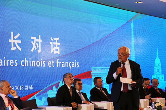 中国网西安9月20日讯(记者 董小迪)19日,第三届中法文化论坛平行活动之一“中法市长对话”在西安举行。来自西安、珠海、泉州、法国图尔、法国尼斯等11个丝路沿线城市的市长及市长代表齐聚一堂,共同探讨文化与城市发展问题。