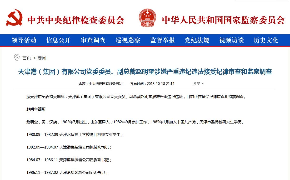 中国网10月18日讯 据中央纪委国家监委网站消息,天津港(集团)有限公司党委委员、副总裁赵明奎涉嫌严重违纪违法,目前正在接受纪律审查和监察调查。