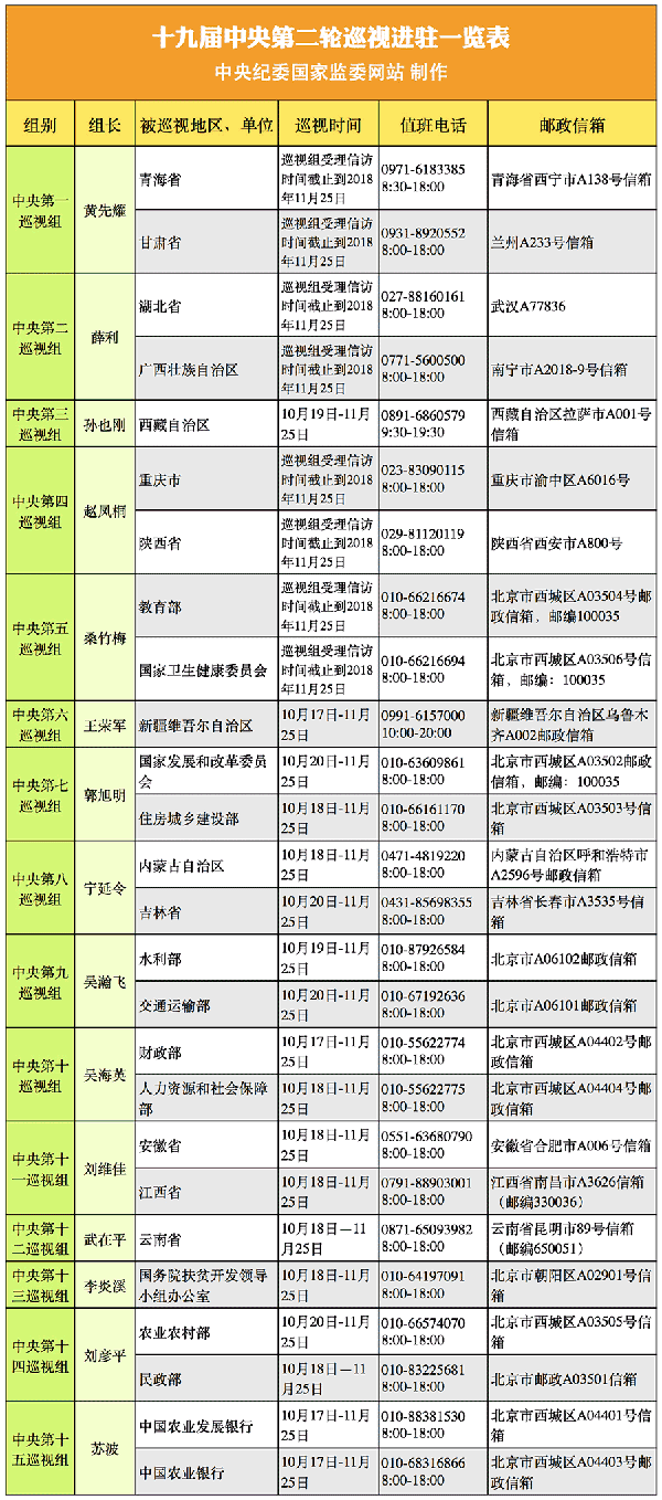 中国网10月22日讯 据中央纪委国家监委消息,十九届中央第二轮巡视各巡视组已于近日陆续进驻,并公布了电话及邮箱等信息。