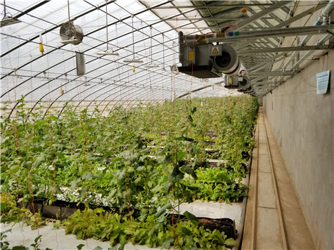 基地占地面积202亩,建有高标准日光温室20栋、钢架塑料大棚158栋,促进劳动力就业30余人,基地以果蔬种植为基础产业,主要以温室种植为主,配套集约化育苗温室、农产品初加工厂房、检测室等设施。2017年基地积极发展现代节水型农业,投资引进了水肥一体化灌溉技术,提升了水分生产效率和化肥利用率,转变了农业发展方式,促进了农业可持续发展。基地注重节能减排工作,2018年年初,基地引入了空气源+地源热泵模块机组,以各温室为单元,配置空气源热泵系统,冬季依靠空气源热泵加热系统对温室进行采暖加温,可使温室内部栽培区域的温度保持在20℃以上,保证农作物生产对环境温度的需求,这种新的环保节能采暖设备不但节约了成本,而且还兼具无废气排放、低耗能、无需人工值守、操作便捷等多重优点。